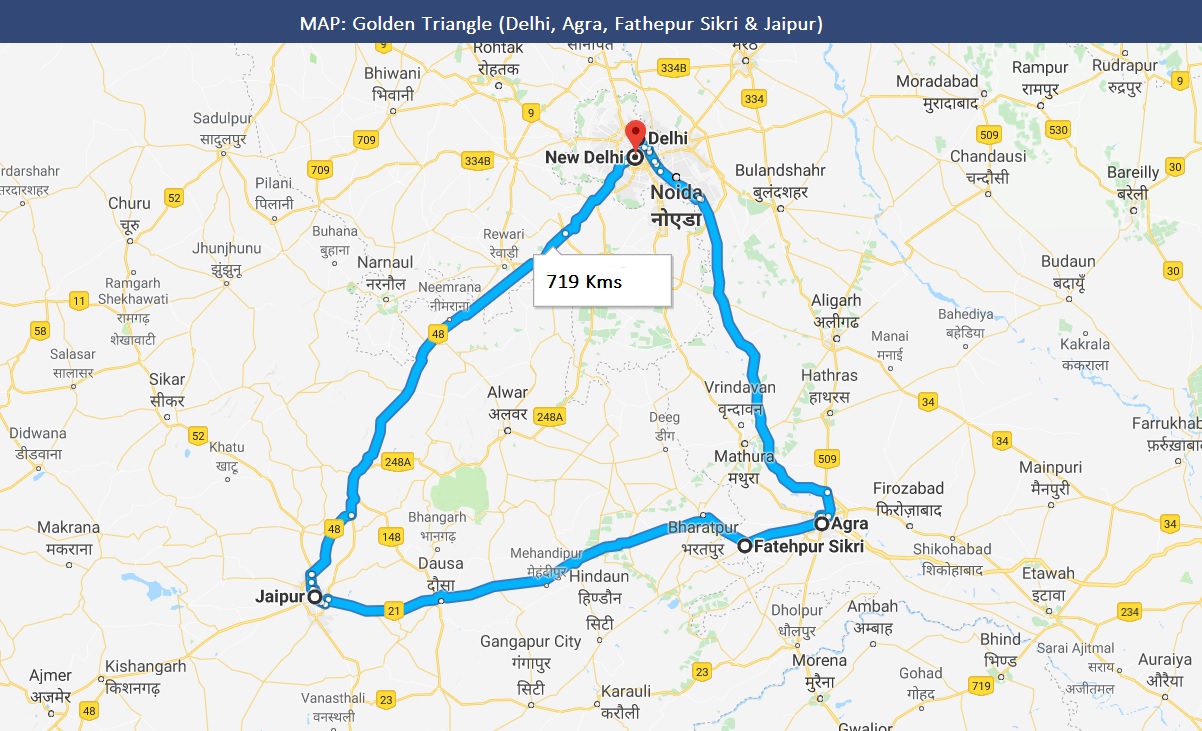 The Golden triangle circuit is about 730 km by road and about 5 - 6 drive on each sector. The Golden Triangle is now a well traveller route providing a good spectrum of the country's with different landscapes.